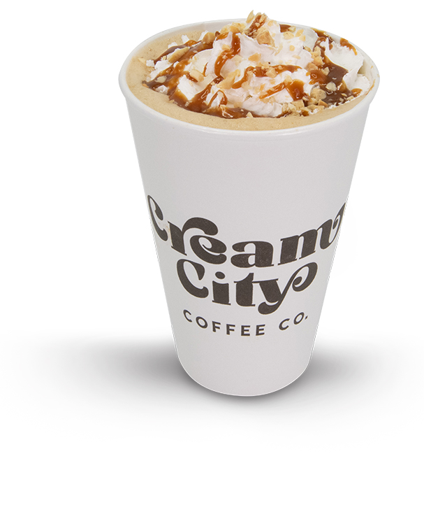 Espresso, 2% milk, caramel sauce, caramelized peanut syrup, topped with whipped cream and chopped peanuts